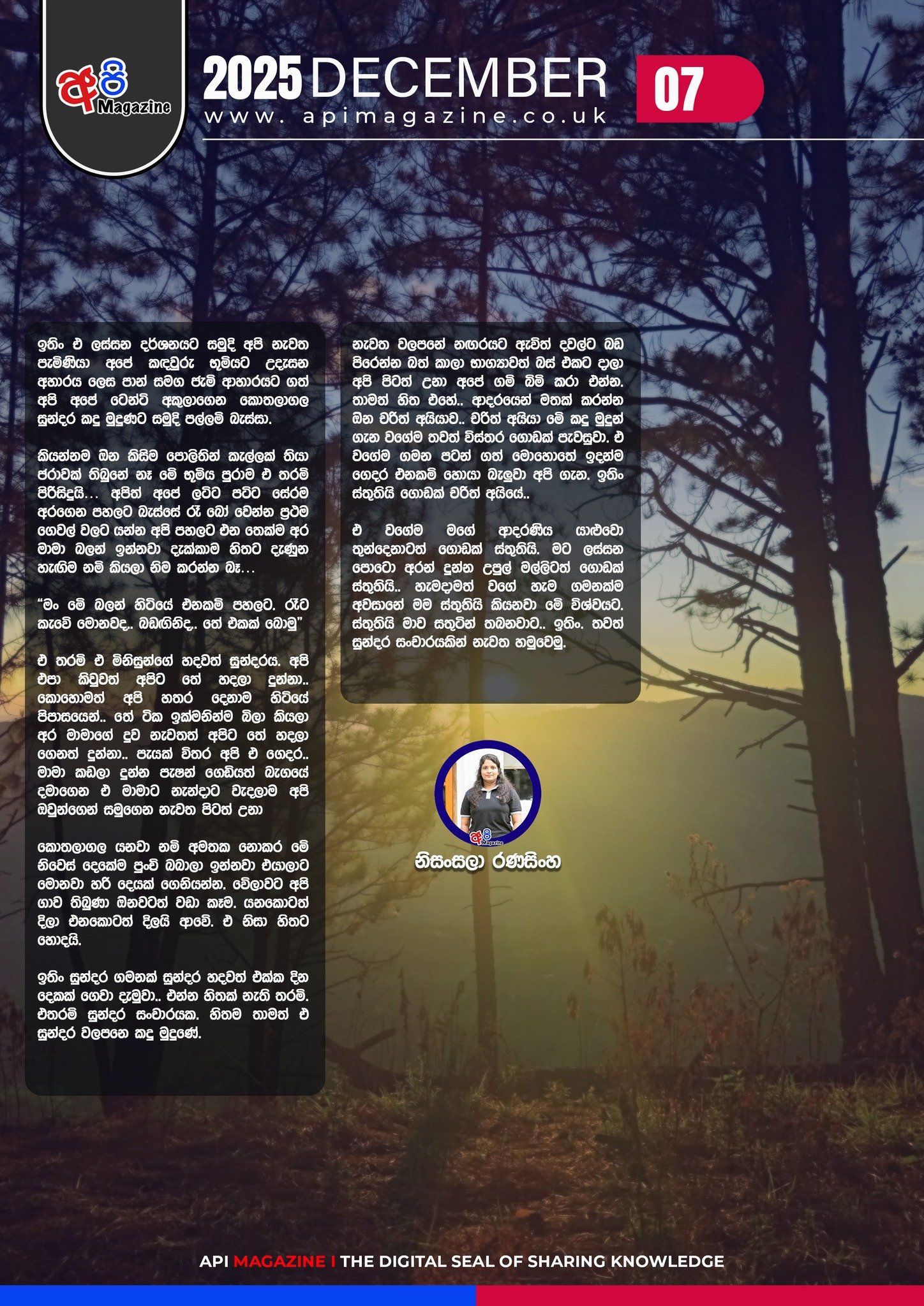 කියන්නම ඔින කිසිම පොලිතින් කැල්ලක් තියා ජරාවක් තිබුනේ නෑ මෙි භූමිය පුරාම… එ තරමි පිරිසිදුයි…. අපිත් අපේ ලටිට පටිට සේරම අරගෙන පහලට බැස්සේ රෑ බෝ වෙන්න ප්රථම ගෙවල් වලට යන්න… අපි පහලට එන තෙක්ම අර මාමා බලන් ඉන්නවා දැක්කාම හිතට දැණුන හැඟිම නමි කියලා නිම කරන්න බෑ…