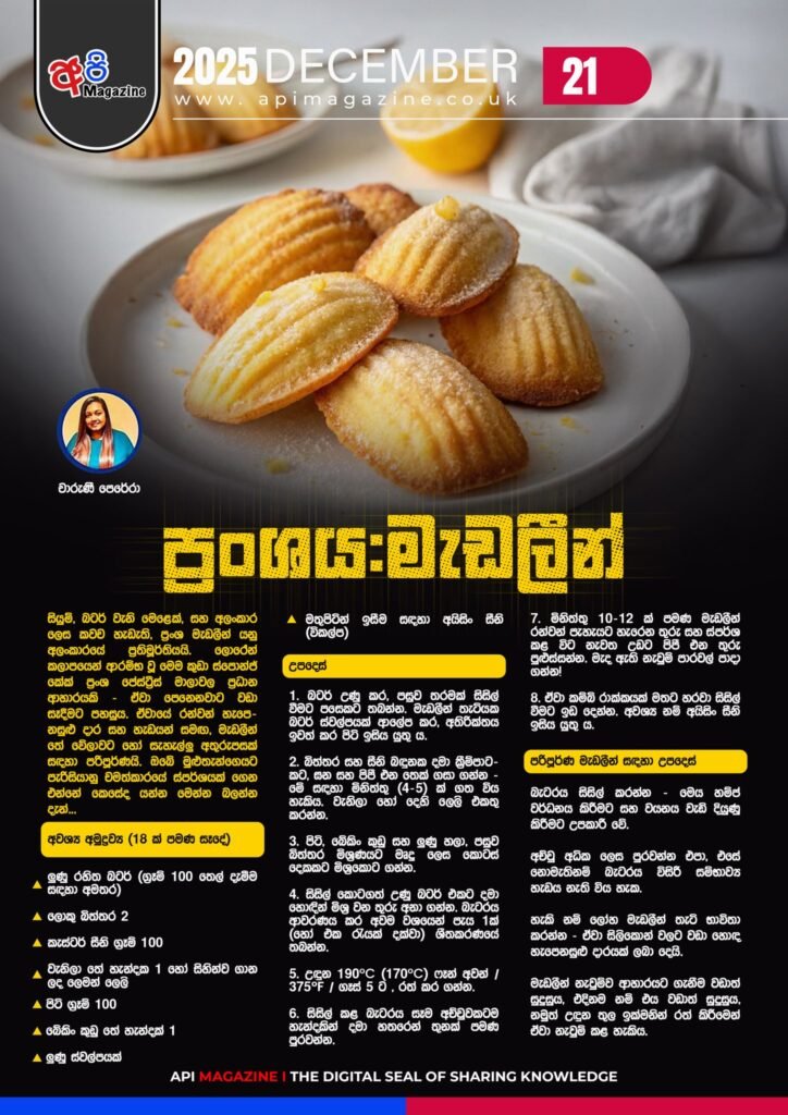 සියුම්, බටර් වැනි මෙළෙක්, සහ අලංකාර ලෙස කවච හැඩැති, ප්රංශ මැඩලීන් යනු අලංකාරයේ ප්රතිමූර්තියයි. ලොරේන් කලාපයෙන් ආරම්භ වූ මෙම කුඩා ස්පොන්ජ් කේක් ප්රංශ පේස්ට්රීස් මාලාවල ප්රධාන ආහාරයකි – ඒවා පෙනෙනවාට වඩා සෑදීමට පහසුය. ඒවායේ රන්වන් හැපෙනසුළු දාර සහ හැඩයන් සමඟ, මැඩලීන් තේ වේලාවට හෝ සැහැල්ලු අතුරුපසක් සඳහා පරිපූර්ණයි. ඔබේ මුළුතැන්ගෙයට පැරිසියානු චමත්කාරයේ ස්පර්ශයක් ගෙන එන්නේ කෙසේද යන්න මෙන්න බලන්න දැන්…අවශ්ය අමුද්රව්ය (18 ක් පමණ සෑදේ)* ලුණු රහිත බටර් ග්රෑම් 100 (තෙල් දැමීම සඳහා අමතර)* ලොකු බිත්තර 2* කැස්ටර් සීනි ග්රෑම් 100* වැනිලා තේ හැන්දක 1 හෝ සිහින්ව ගාන ලද ලෙමන් ලෙලි* පිටි ග්රෑම් 100* බේකිං කුඩු තේ හැන්දක් 1* ලුණු ස්වල්පයක්* මතුපිටින් ඉසීම සඳහා අයිසිං සීනි (විකල්ප)උපදෙස්1. බටර් උණු කර, පසුව තරමක් සිසිල් වීමට පසෙකට තබන්න. මැඩලීන් තැටියක බටර් ස්වල්පයක් ආලේප කර, අතිරික්තය ඉවත් කර පිටි ඉසිය යුතු ය.2. බිත්තර සහ සීනි බඳුනක දමා ක්රීම්පාටකට, ඝන සහ පිපී එන තෙක් ගසා ගන්න – මේ සඳහා මිනිත්තු 4-5 ක් ගත විය හැකිය. වැනිලා හෝ දෙහි ලෙලි එකතු කරන්න.3. පිටි, බේකිං කුඩු සහ ලුණු හලා, පසුව බිත්තර මිශ්රණයට මෘදු ලෙස කොටස් දෙකකට මිශ්රකොට ගන්න.4. සිසිල් කොටගත් උණු බටර් එකට දමා හොඳින් මිශ්ර වන තුරු අනා ගන්න. බැටරය ආවරණය කර අවම වශයෙන් පැය 1ක් (හෝ එක රැයක් දක්වා) ශීතකරණයේ තබන්න.5. උඳුන 190°C (170°C ෆෑන් අවන්) / 375°F / ගෑස් 5 ට , රත් කර ගන්න.6. සිසිල් කළ බැටරය සෑම අච්චුවකටම හැන්දකින් දමා හතරෙන් තුනක් පමණ පුරවන්න.7. මිනිත්තු 10-12ක්ක් පමණ මැඩලීන් රන්වන් පැහැයට හැරෙන තුරු සහ ස්පර්ශ කළ විට නැවත උඩට පිපී එන තුරු පුළුස්සන්න. මැද ඇති නැවුම් පාරවල් පාදා ගන්න!8. ඒවා කම්බි රාක්කයක් මතට හරවා සිසිල් වීමට ඉඩ දෙන්න. අවශ්ය නම් අයිසිං සීනි ඉසිය යුතු ය.පරිපූර්ණ මැඩලීන් සඳහා උපදෙස්–* බැටරය සිසිල් කරන්න—මෙය හම්ප් වර්ධනය කිරීමට සහ වයනය වැඩි දියුණු කිරීමට උපකාරී වේ.* අච්චු අධික ලෙස පුරවන්න එපා, එසේ නොමැතිනම් බැටරය විසිරී සම්භාව්ය හැඩය නැති විය හැක.* හැකි නම් ලෝහ මැඩලීන් තැටි භාවිතා කරන්න—ඒවා සිලිකොන් වලට වඩා හොඳ හැපෙනසුළු දාරයක් ලබා දෙයි.* මැඩලීන් නැවුම්ව ආහාරයට ගැනීම වඩාත් සුදුසුය, එදිනම නම් එය වඩාත් සුදුසුය, නමුත් උඳුන තුල ඉක්මනින් රත් කිරීමෙන් ඒවා නැවුම් කළ හැකිය.